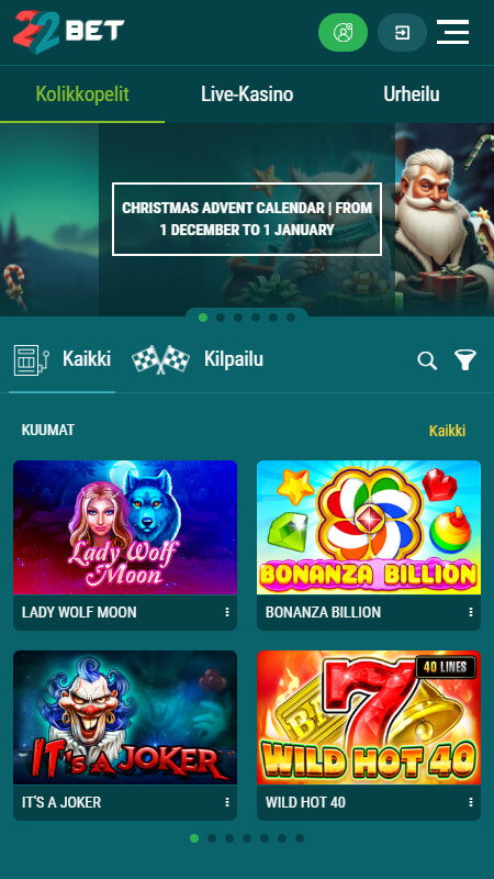 Mikäli online-kasino kattavalla pelivalikoimalla ja upeilla tarjouksilla sekä bonuksilla, kuulostaa sinulle sopivalta vaihtoehdolta, on aika suunnata 22BET kasinolle! 22BET kasinolla voit pääset nauttimaan kaikesta mahdollisesta, mitä online-kasinot voivat tarjota – kolikkoepeleistä, live-peleistä ja vedonlyönnistä urheilutapahtumissa. Moderni sivusto ja pelien laatu tekevät 22BET kasinoelämyksestä entistä miellyttävämmän. Valikoimasta löytyy kattavasti pelejä alan huippupelinvalmistajilta, kuten Microgaming, NextGen Gaming, Thunderkick, Betsoft, Red Tiger Gaming, Rival, Elk Studios, PariPlay, Playson ja GameArt.