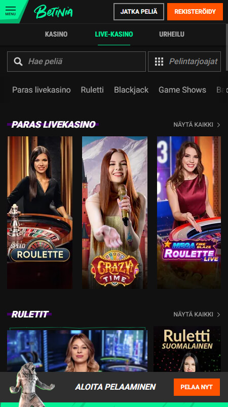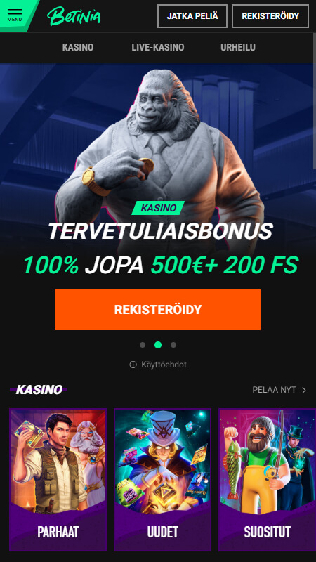 Betinia casino on suomalaiseen makuun oleva nettikasino, jonka pelivalikoimaan on valittu selkeästi pelejä juuri suomalaiset mielessä. Tämä on ns. hybridinettokasino eli se on sekä pikakasino, että kasino, jonne rekisteröidytään ennen pelaamisen aloittamista. Kasinosivusto on täynnä toinen toistaan hienompia animaatioita ja kuvia, joten tämä myös näyttää mukavalta pelipaikalta sen lisäksi, että siellä on mukava pelata.