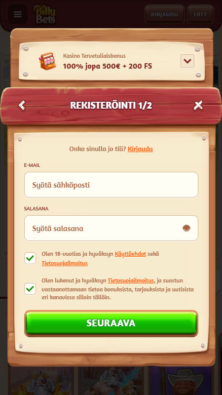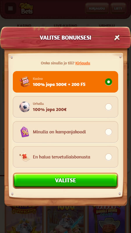 | 🎁 Tervetuliaisbonus | Jopa 500 € + 200 ilmaiskierrosta |