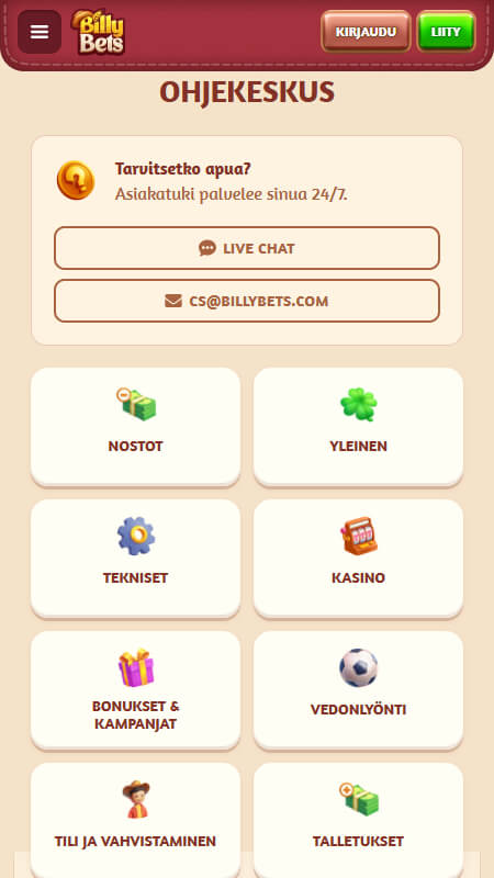 BillyBetsin asiakastuen saa kiinni sähköpostitse tai live-chatin kautta. Sähköposteihin voi odottaa saavansa vastauksen noin vuorokaudessa ja chat vastaa noin 5 minuutissa. Testatessamme nettikasinoa chatissa oli mahdollista saada apua englannin kielellä, tai suomen kielellä konekääntäjän kautta. Asiakaspalvelu oli ammattitaitoista, joten visaisiinkin kysymyksiin sai vastauksen nopeasti.