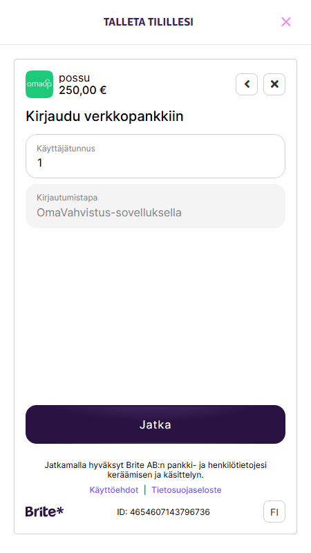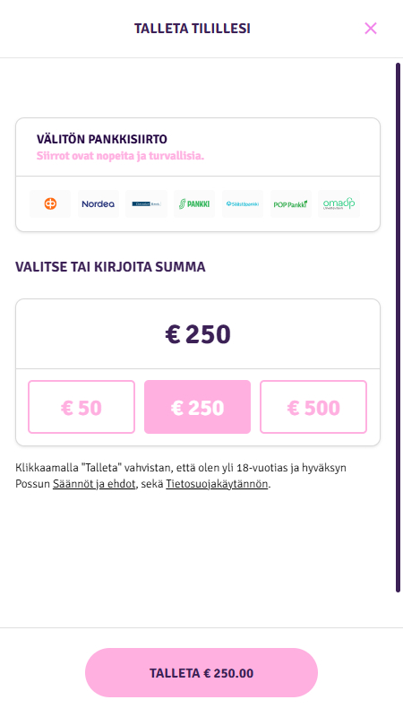 Valitse haluamasi talletussumma ja paina TALLETA-painiketta.