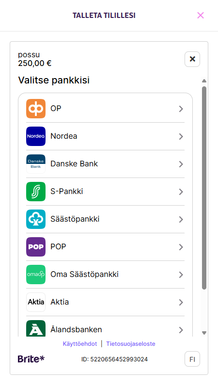 Suomalaiset pelaajat arvostavat usein kasinoilla maksutapojen monipuolisuutta, mutta Possu Casinolla rahansiirrot hoituvat ainoastaan maksupalvelu Briten kautta. Vaikka valinnanvaraa ei ole, Brite on turvallinen ja luotettava maksuvaihtoehto, joka on Ruotsin Finanssivalvonnan alainen. Brite toimii kaikkien suomalaisten pankkien kanssa, joten se on turvallinen ja nopea maksutapa. Talletukset ovat välittömiä ja minimitalletus on vain euron. Kotiutukset sujuvat myös nopeasti ilman lisäkuluja, ja parhaimmillaan varat saapuvat lähes välittömästi, ilman pitkiä odotusaikoja.