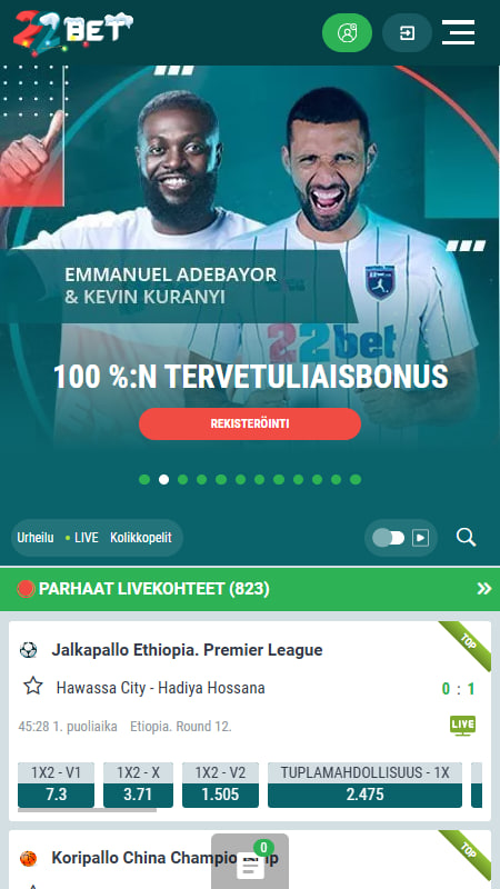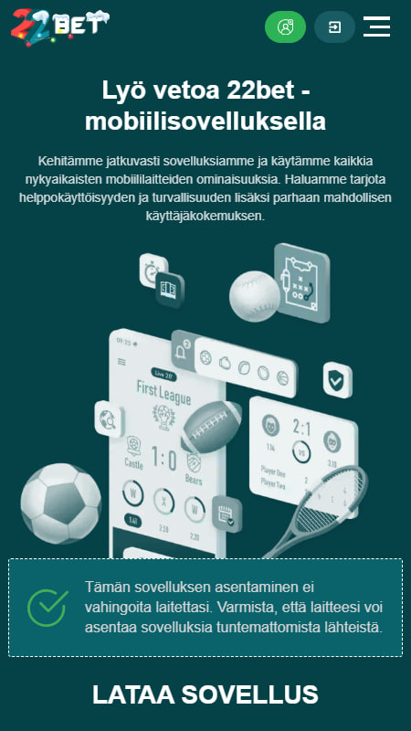 Mobiiliversio on erinomainen keino, jolla pääset lyömään vetoa suosikki urheilulajiesi parissa kätevästi älypuhelimellasi tai vaikka tabletillasi. 22BETin vedonlyöntipalvelut ovat saatavilla mobiiliselaimella, minkä ansiosta voit nauttia vedonlyönnistä juuri silloin kun se sinulle parhaiten sopii. Päästäksesi käsiksi 22BETin mobiiliversioon, ei sinun tarvitse ladata erillisiä sovelluksia. Siirry suoraan tutulle vedonlyöntisivustolle mobiililaitteesi selaimella ja saat käyttöösi upean ja moitteettomasti toimivan mobiiliversion 22BET vedonlyönnistä!