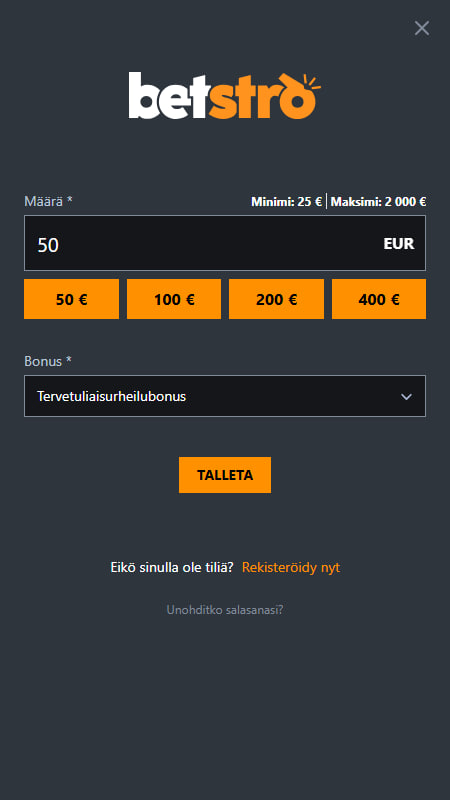 Betstro antaa uusille tulokkaille tervetuliaisbonuksen, joka on 100% talletusbonus jopa 200 euroon asti. Tämä bonus on saatavilla ensimmäisellä talletuksella, joten käyttäjä voi valita sen talletusprosessin yhteydessä. Uusille asiakkaille on kaksi bonustarjous vaihtoehtoa joista valita, ne ovat seuraavat: