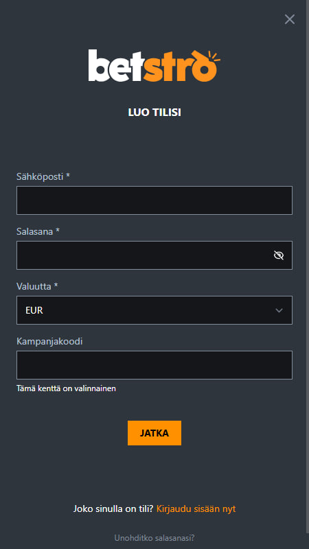 Jos tervetuliaisbonuksen haluaa jättää väliin se on myös mahdollista, tällöin vetovalikosta tulee valita “Ei bonusta”. Ohjeet tervetuliaisbonuksen hankkimiseen löytyvät kappaleesta “Rekisteröityminen Betstroon”.