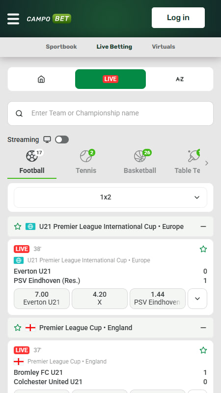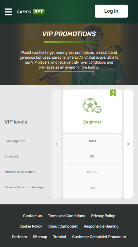 Ottelua edeltävä osio sisältää yli 35 urheilulajia jalkapallosta ja koripallosta pyöräilyyn ja mäkihyppyyn. Keskimääräinen palautusprosentti on noin 94 %. CampoBetillä on viisi VIP-tasoa aloittelijasta Legendiin.