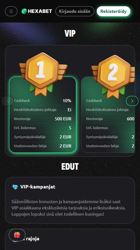 Vedonlyöntibonusten puuttuminen voi johtua tietysti ihan siitä, että vuonna 2024 julkaistu sivusto ei ole ehtinyt lisätä tarjolle vielä vedonlyöntibonuksia. Koska monet muut vedonvälittäjät tarjoavat esimerkiksi talletusbonusta, ilmaisia vetoja ja korotettuja kertoimia, voimme hyvinkin nähdä näitä myös Hexabetin valikoimassa myöhemmin.